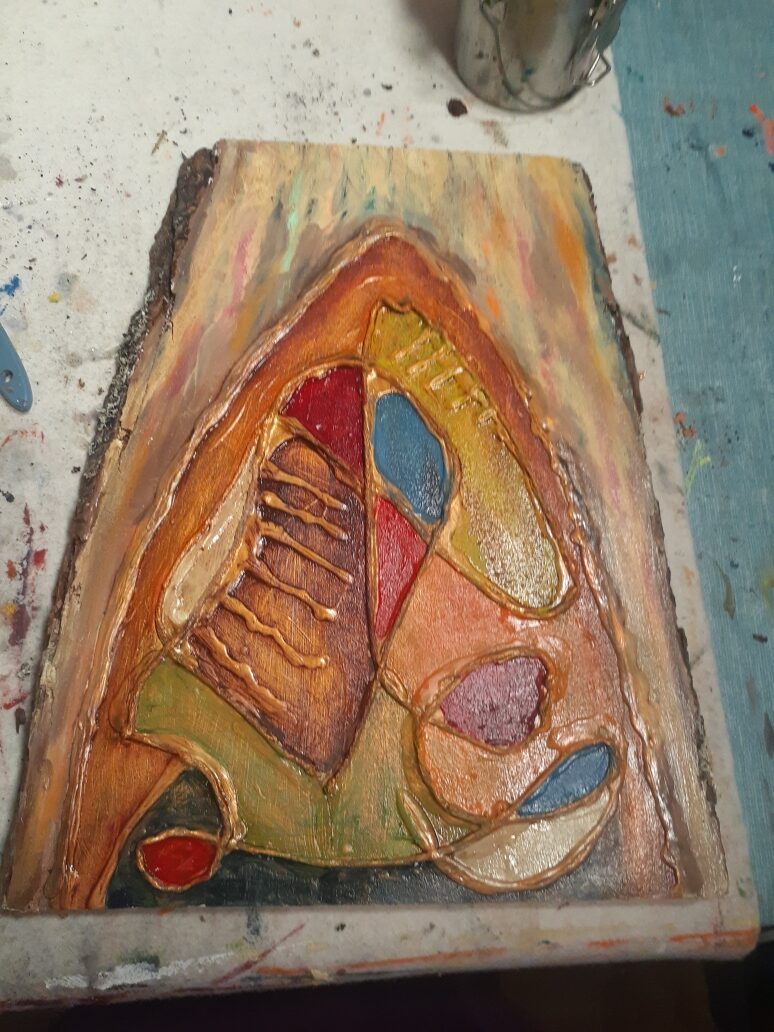 Abstract with texture I glazed the entire piece with Burnt Umber…sort of Antiquing it. Now it is complete