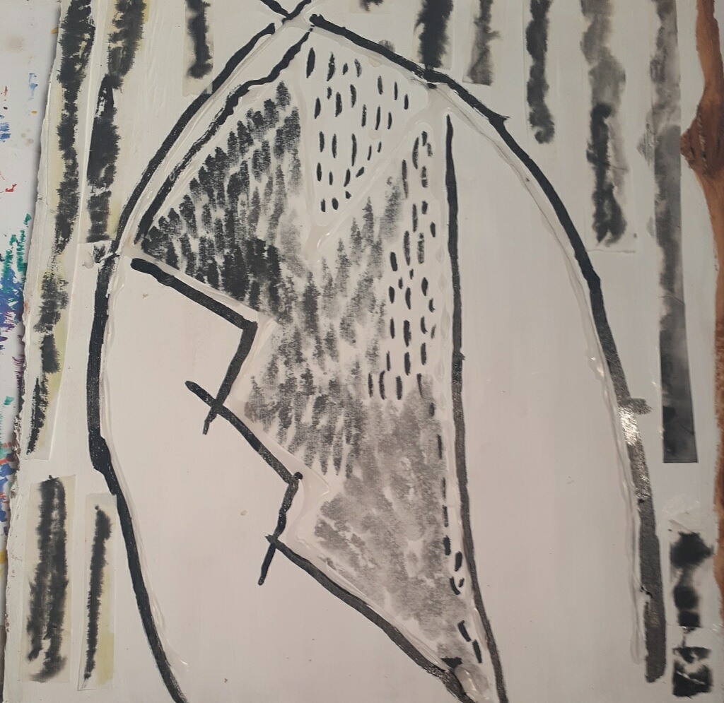 Beginning of new abstract. I collaged rice paper with ink marks and used craft glue for raised texture